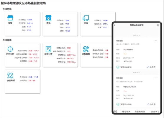 监管人员不再需要统计每天的不合格内容。在监管人员巡查后,系统在PC端对于巡查结果自动统计,并进行智能分类。同时将存在隐患和不合格的内容,通过微信小程序的方式发送给监管人员,使其第一时间发现问题并做出对应的处理。高效精准识别各种问题,将监管人员从底层的繁重资料工作中解脱出来,把工作重心放在系统自动发现的问题上。极大的提高工作的及时性、准确性、效率性。