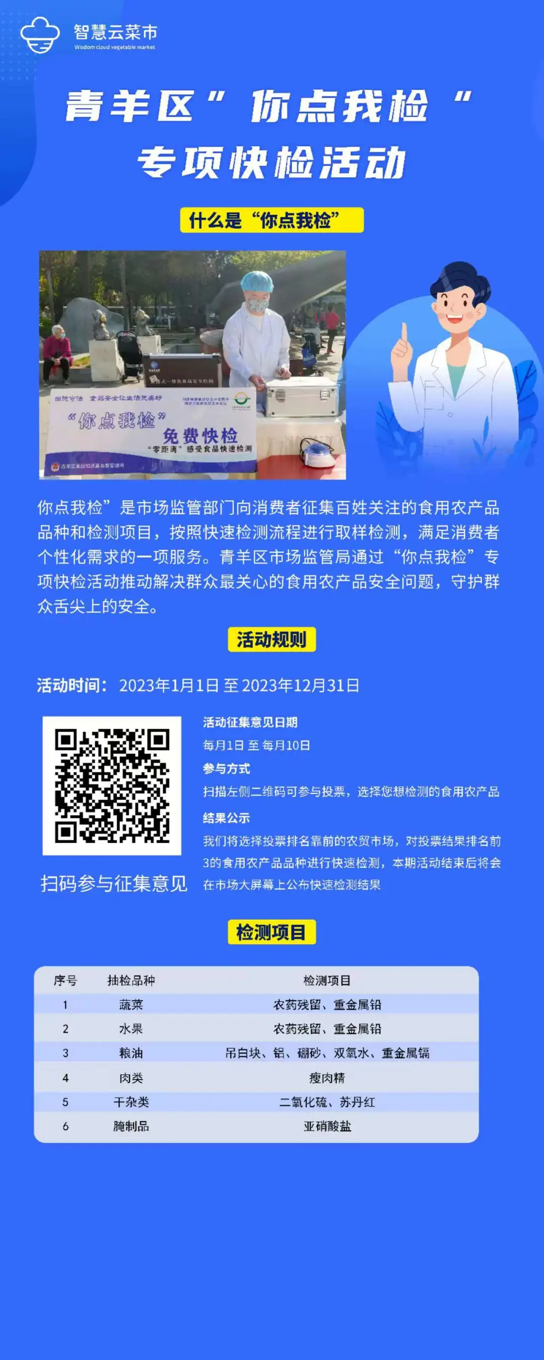 活动共设置鹏瑞利青羊广场,优品道广场,西村,新城市广场,文家场5个宣传点位,通过让消费者"点"出关心的食品品种,抽群众所想、检群众所盼,以检验检测"小窗口"促进食品安全"大监管",推进食品安全社会共治。青羊区市场监管局通过"你点我检"专项快检活动推动解决群众最关心的食用农产品安全问题,守护群众舌尖上的安全。